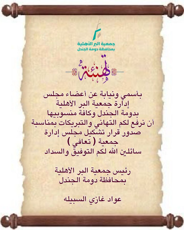 بأسمي ونيابة عن أعضاء مجلس إدارة الجمعية وكافة منسوبيها أن نرفع لكم التهاني والتبريكات بمناسبة صدور قرار تشكيل مجلس إدارة جمعية ( تعافي ) . سائلين الله لكم التوفيق والسداد.