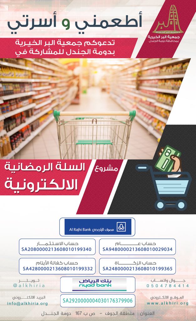 تدعوكم جمعية البر الخيرية بدومة الجندل للمشاركة في دعم مشروع السلة الرمضانية الإلكترونية لعام 1440 هـ .