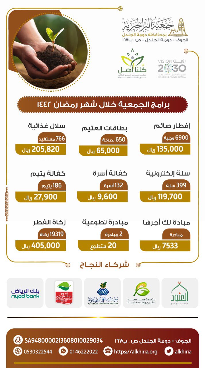 بحمد الله وتوفيقه نفذت جمعية البر الخيرية بدومة الجندل البرامج التالية في شهر رمضان 1442 هـ : برنامج إفطار صائم حيث بلغت عدد الوجبات التي ... قراءة المزيد