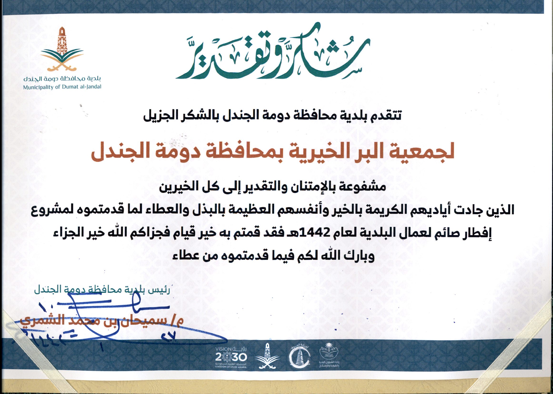 شهادة شكر وتقدير للجمعية من بلدية محافظة دومة الجندل لدورها في تنفيذ برنامج افطار صائم لعام 1442 هـ . ... قراءة المزيد