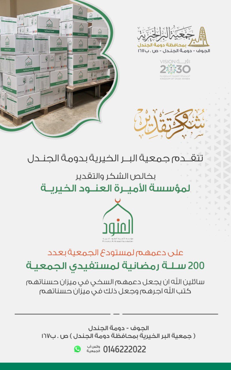 تتقدم جمعية البر الخيرية بدومة الجندل بخالص الشكر والتقدير لمؤسسة الشيخ / عبدالله بن صالح العثيم و أولاده الخيرية على دعمهم للسلة الرمضانية لعام 1442هـ ... قراءة المزيد
