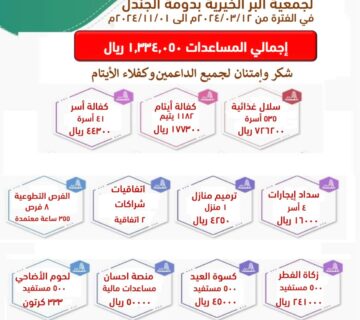 التقرير الدوري لجمعية البر الخيرية بدومة الجندل لجميع البرامج المنفذة في القترة من 2024/03/12م الى 2024/11/01م شكر وامتنان لجميع الداعمين وكفلاء الأيتام. ... قراءة المزيد
